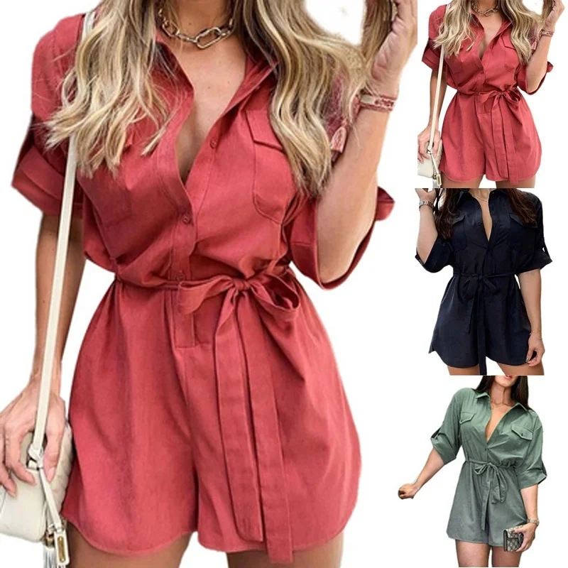 Name: Mono de encaje para mujer, ropa de calle, mono de manga corta con bolsillos de pecho, cuello de solapa, mono suelto, ropa